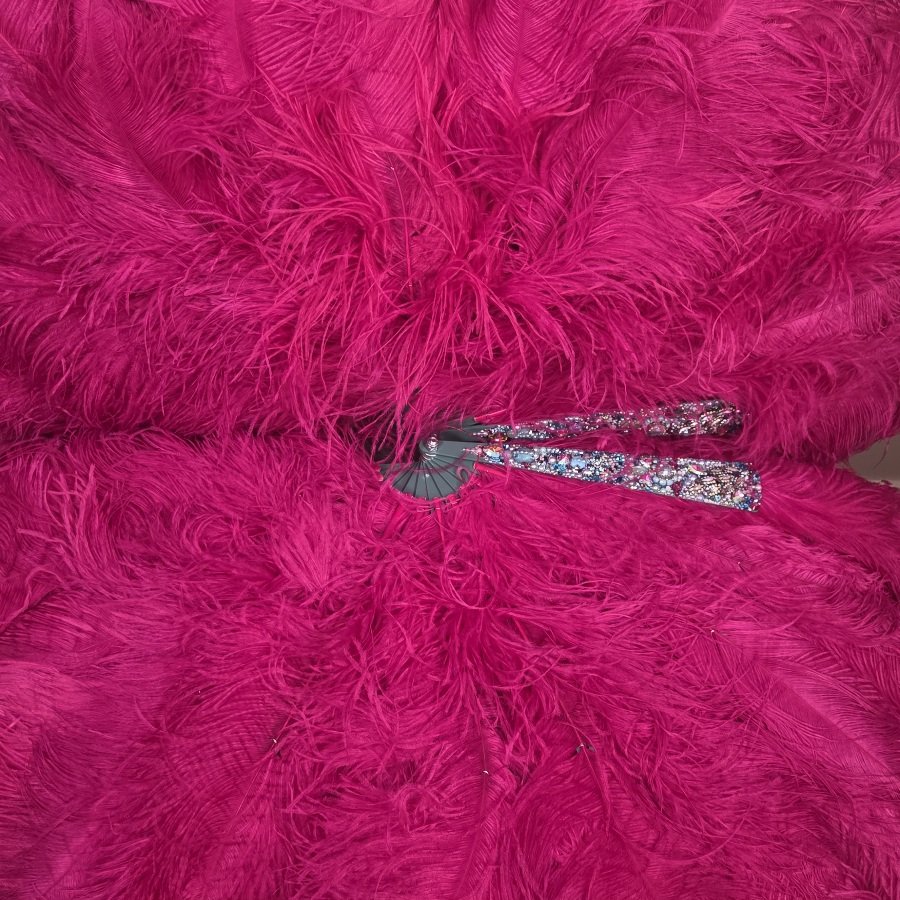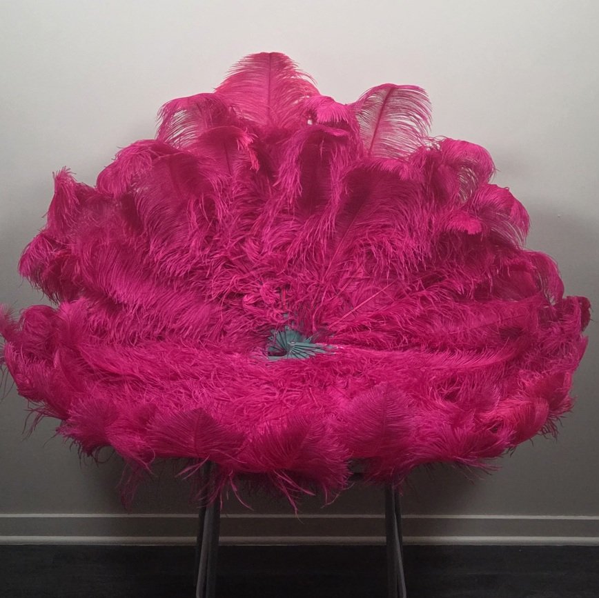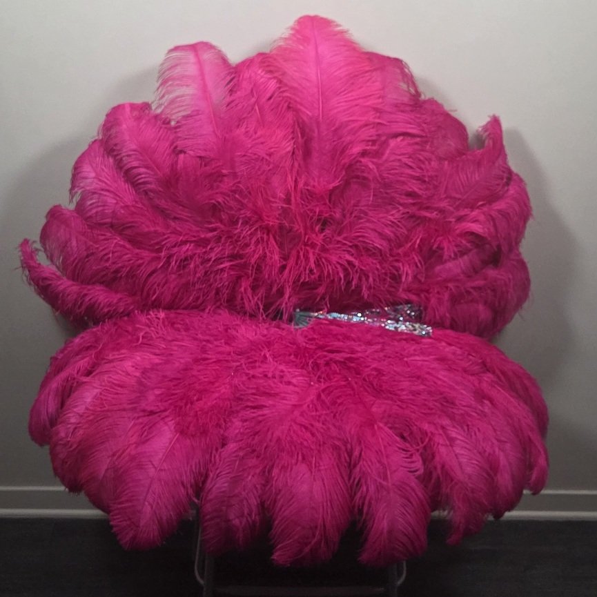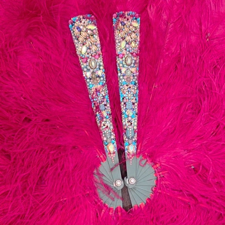 Set of 2 fans each with 12 12″ staves and 36 plumes sized 18-20″ (27″ at center) in a ruby pink salvaged feathers. Front accent staves encrusted by Bold Burlesque (@boldburlesquepasties).