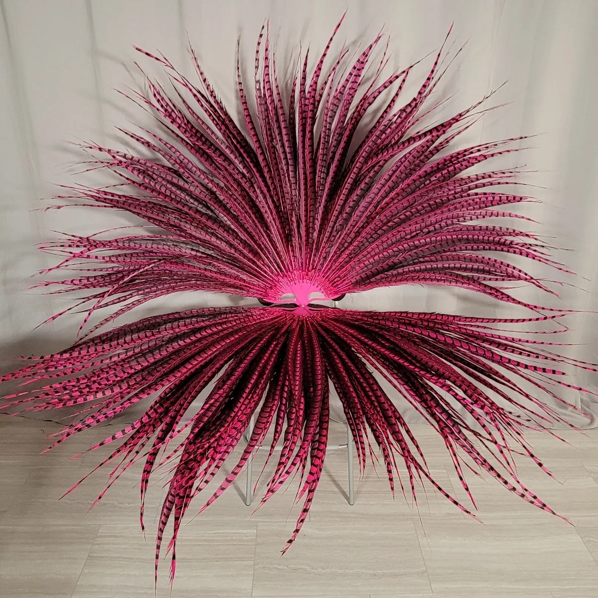 The set features 300 35″+ lady am pheasant feathers (color #3 @happinesscathy) on a custom structure. The gloss black middle component was designed by her husband! I was able to adjust my V-staves handle cutouts in peacock pink to snuggle right into the design. The set doesn’t open/close because of the design complexity, but feels very secure when bolted open. Can’t wait to see how Lucy blings these out!