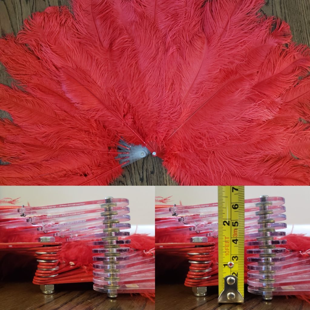 Lighter, slimmer and more durable than bamboo or acrylic, my metal staves are superior! While they collapse and open like regular fans, they can be tightened with no risk of cracking. They also come in any color (to disappear or provide a color pop), including metallics! Plus, I produce a variety of sizes for ostrich plume and boa fans, shapes for pheasant and peacock fans, and custom stave shapes are possible as well. You’ll be surprised by how much they can positively impact your performance as well as save you repair time/money (especially for troupes and prop departments).